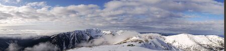 Snow covered mountains with clouds and mist in valley, Low Tatras Dumbier, Slovakia