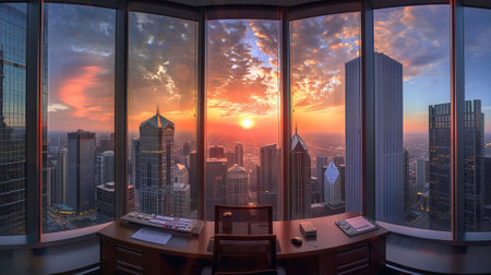 Office window panorama during the morning hours, offering a peaceful glimpse of the waking cityscape and its gradual transformation under the soft morning glow