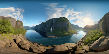 360 panorama of a river and mountains, AI