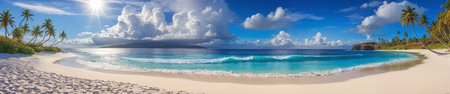 Ocean coast panorama in calm weather with small waves, blue sky, white clouds and bright sun. palm leaves in the foreground. seascape illustration. Generative AI