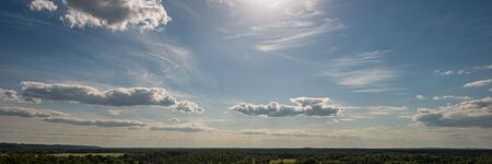 Sky and clouds over the meadow and forest on a sunny day. Summer season. Web banner. Ukraine. Europe.