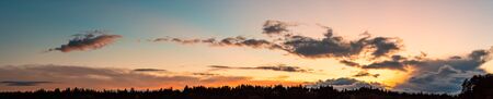 Panorama during sunset over forest with pastel colors sky and colorful clouds. Nature background