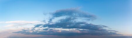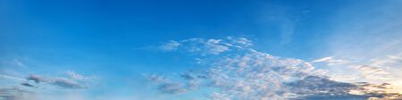Summer sunset sky panorama with fleese clouds. Summer evening good weather sky background.