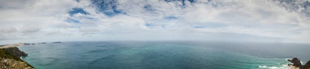 Panorama of a sea landscape with white clouds and the quiet blue water
