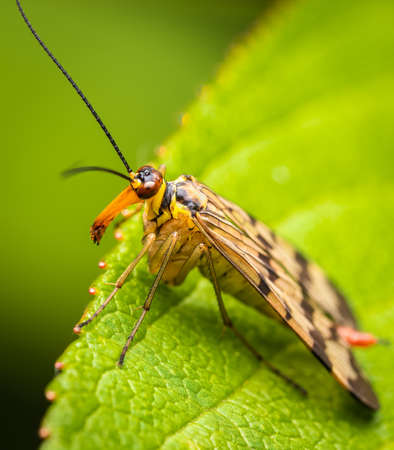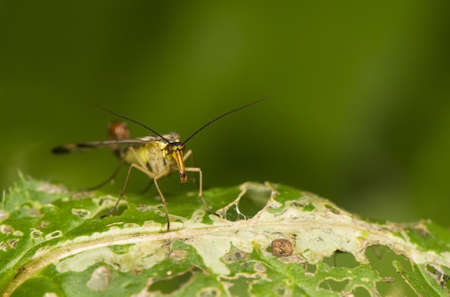 Natural closeup on a female Common scorpionfly, Panorpa vulgaris sitting on a green leaf