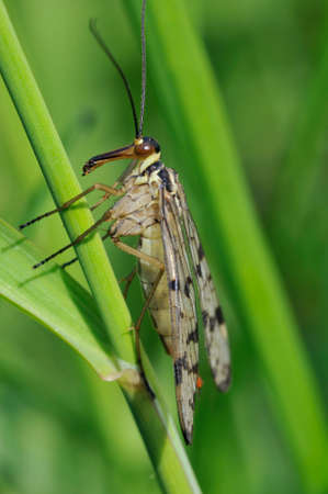 scorpion fly perched on grass, greenish background with space for copy. male specimen of panorpa communis. vertical pictures. nature.