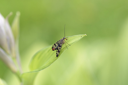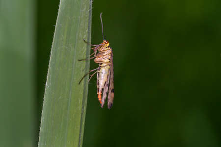Natural closeup on a female Common scorpionfly, Panorpa vulgaris sitting on a green leaf