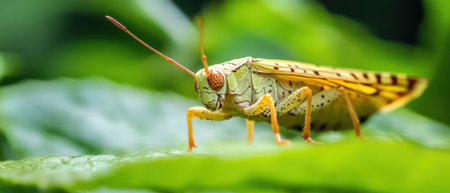 A grasshopper is perched on a vibrant green leaf showcasing its intricate patterns and colors while sunlight reflects on its body.