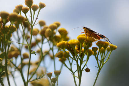 Scarlet tiger moth on a tansy flower or bitter buttons plant. Red and black colorful butterfly on a yellow plant, side view sky in the background.