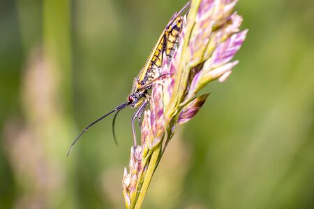 Panorpa communis, common scorpionfly, resting on a stem in a green meadow.