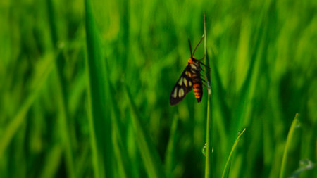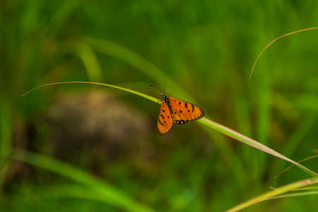 close-up photo of a range butterfly on the grass waiting for the wind to fly, with a blurred background