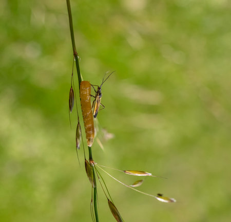 Meadow plant bug resting on a yellow caterpillar on a grass stipe in green ambiance