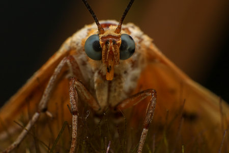 Close up of Asota caricae moth on green leaf in nature, focusing on its face, flash fired