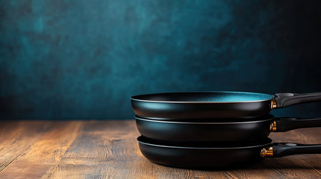 A modern stack of sleek, non-stick frying pans resting on a wooden kitchen countertop, showcasing an elegant black finish against a textured blue backdrop.