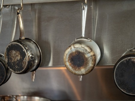 Four steel saucepans with burnt bottoms hanging in industrial kitchen