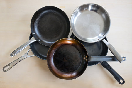 Selection of frying pans made from various material, stainless steel, cast iron, carbon steel and PTFE non-stick coated, high angle view from above, light wooden background, selected focus