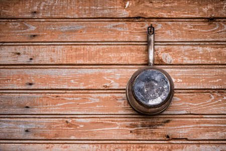 Cooking pan hanging on the kitchen wall after cleaning is complete.