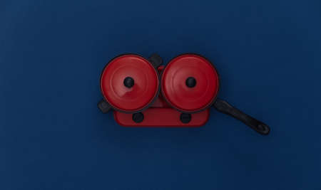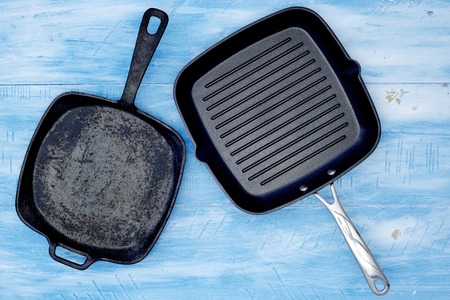 Frying pan with a non-stick coating on blue wooden background. Cooking equipment. Top view