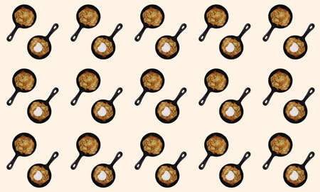 Seamless pattern of fried potato pancakes in a pan. Delicious and satisfying food. beige isolated background. Print and design concept