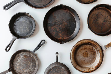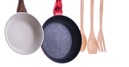 Two frying pans, one old and worn, and a modern one, with a wooden spatula, lying on a white background, create a minimalist cooking scene