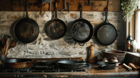 A rustic kitchen scene with cast iron skillets hanging on a wall