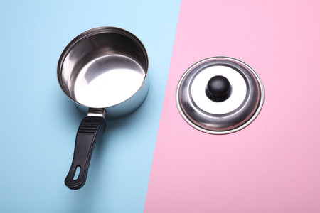 Flat lay of three pots stack on top of each other. Cooking concept Copy space
