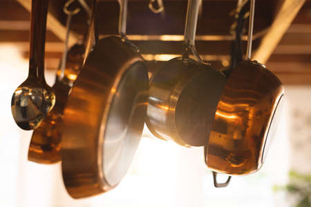 Image of copper pots and plates hanging in kitchen. Home, household and interior design concept.