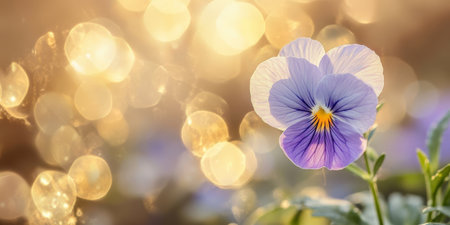A beautiful pansy flower, vibrant with colors, stands against a backdrop of golden light and soft bokeh, capturing the essence of spring and showcasing natures extraordinary beauty