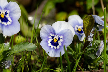 Light blue viola flowers, spring blossom in garden