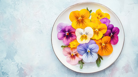 A vibrant arrangement of edible pansy flowers in various colors on a white plate against a light background, perfect for culinary decoration or floral presentations.