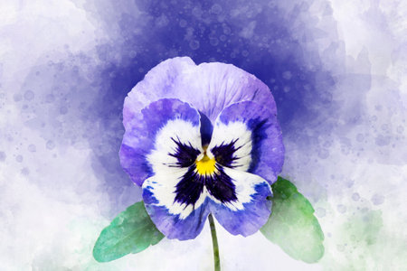 Close-up of purple pansy flower in watercolor. Botanical illustration for greeting card.