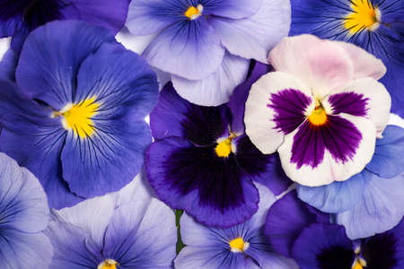 Violet tricolor viola pansies. Vegetable flower background.