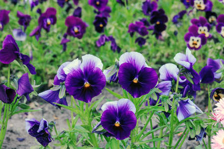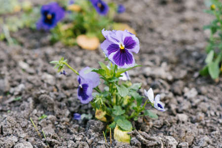 Garden violets in the flower bed. Flowering pansies.