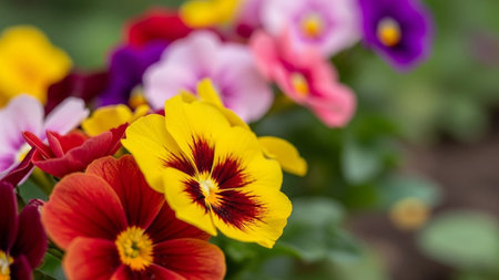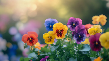 A vibrant cluster of colorful pansy flowers with yellow red purple and pink petals is captured in soft focus with a...