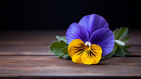 Pansy (Viola tricolor) flower set against a rustic wood background. The wood backdrop complements the vibrant hues of the Pansy. Ample copy space allows for personalized messages or branding