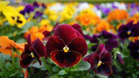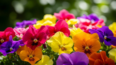 Colorful pansies blooming in a sunlit garden during springtime, showcasing a variety of vibrant hues and delicate petals
