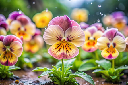 Colorful pansy flowers in the garden after rain, stock photo