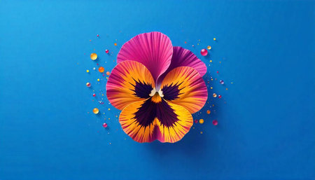 Vibrant pansy flower with confetti on a blue background