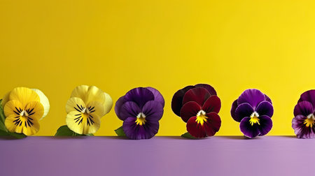 Colorful pansy flowers on a yellow background with copy space.