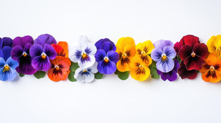 Pansy flowers arranged in a rainbow pattern over a white background