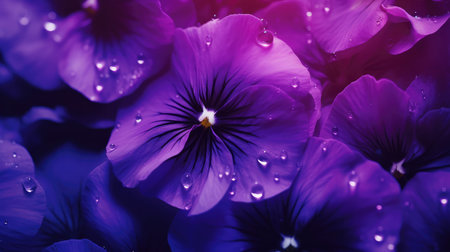 Close up of a Pansy and dew drops, foreground sharp with bokeh backgroud. ai generative