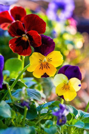 Multicolored pansy flower plant natural background, summer time. Close up