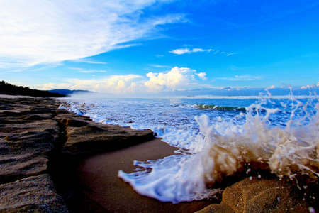 Photo of large waves crashing in sand beach rocks on bali island in Indonesia