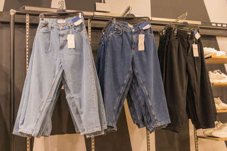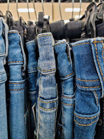 In a clothing store, fashionable jeans of different colors, sizes and models hang on hangers. shopping and sale. Choosing clothes to buy.