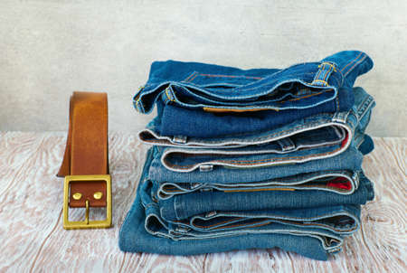Blue jeans on a brown wooden background and Blue jeans denim Collection jeans stacked