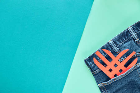 Golden bitcoin in the back pocket of jeans.