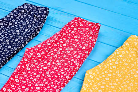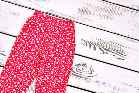 Girls pants on white wooden background. Cropped shot of clothes. Floral pattern. Discount sale, clothing collection.