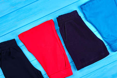 Kids colored shorts background. Setting of different shorts for boys on wooden background. Toddlers summer clothing.