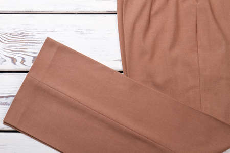 Women costume pants close up. Female classic brown color trousers on wooden table. Womans elegant outfit.