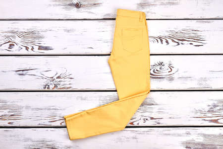 Lady denim fashion trousers. Girls yellow skinny pants on white wooden background. Female fashion apparel on sale.